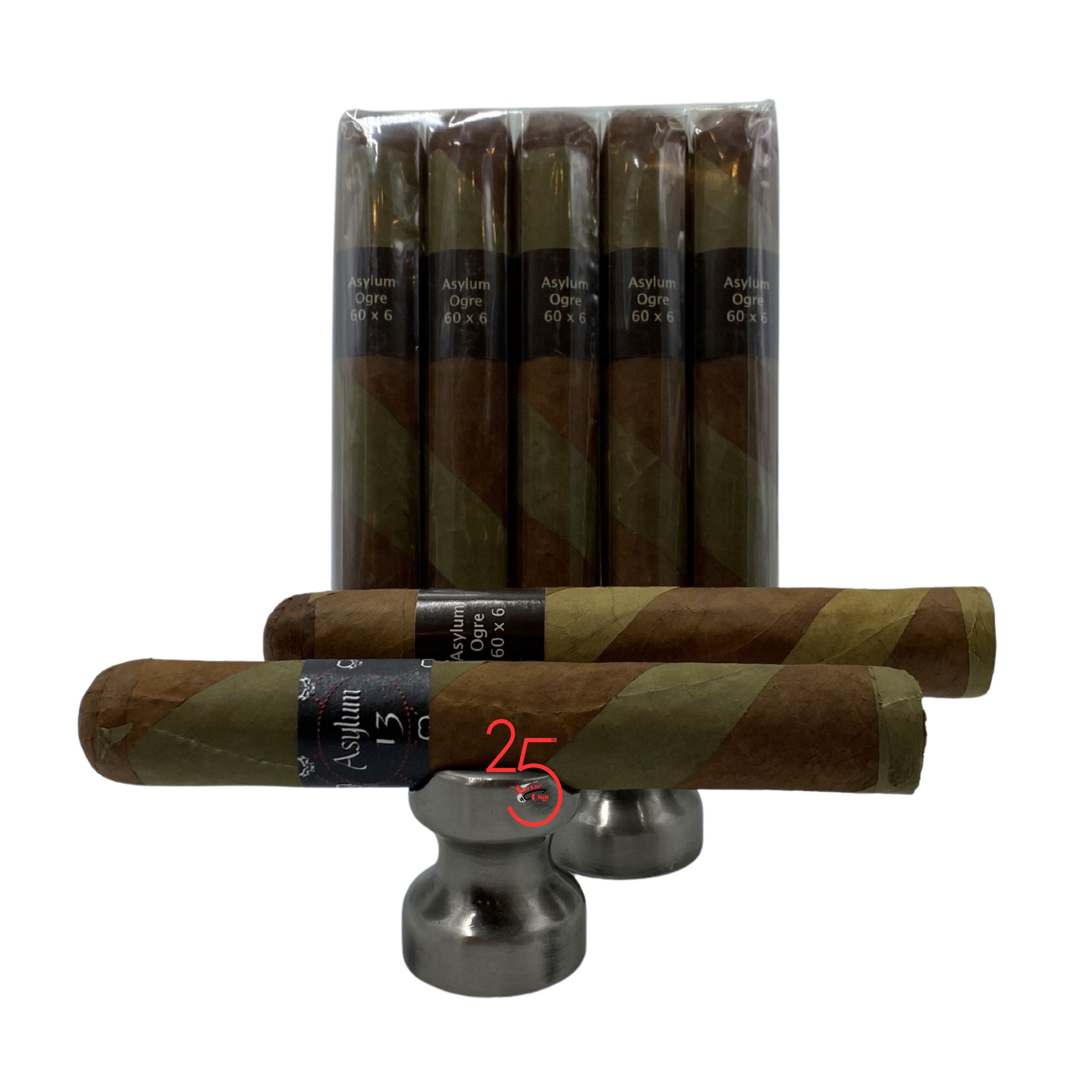 The Asylum 13 Ogre cigar is an extraordinary example of innovative craftsmanship, blending a beautiful barber-pole wrapper with both a Candela and a Habano. This cigar is medium to full-bodied, and filled with a rich blend of Nicaraguan fillers. The dual-wrapper boosts spicy and earthy notes.